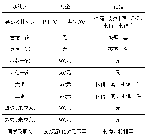 表2 吴姨女儿出嫁随礼单