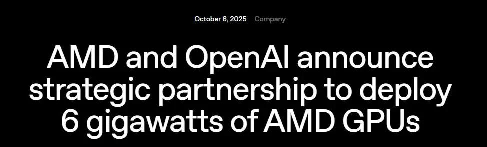 10月6日,OpenAI在官网宣布与AMD达成合作协议,将部署总计6吉瓦的AMD GPU算力。