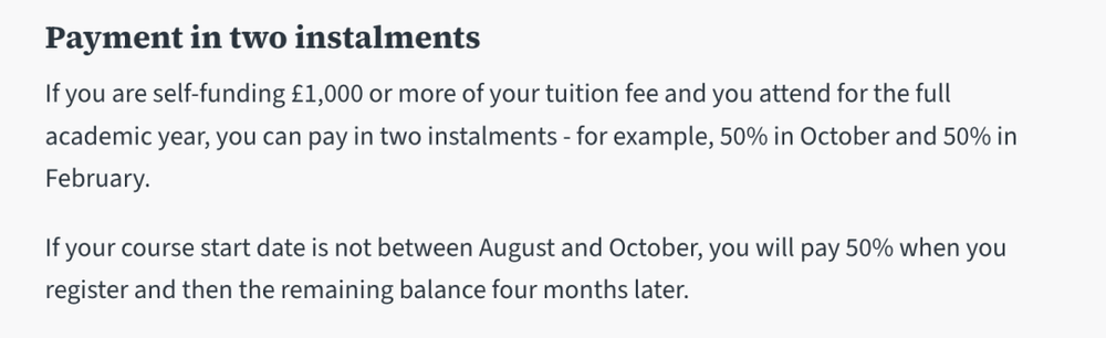 如果你是自费支付学费,并且学费金额在 £1,000 或以上,同时就读整个学年,那么你可以选择分两期付款 —— 例如,10 月支付 50%,次年 2 月支付 50%。