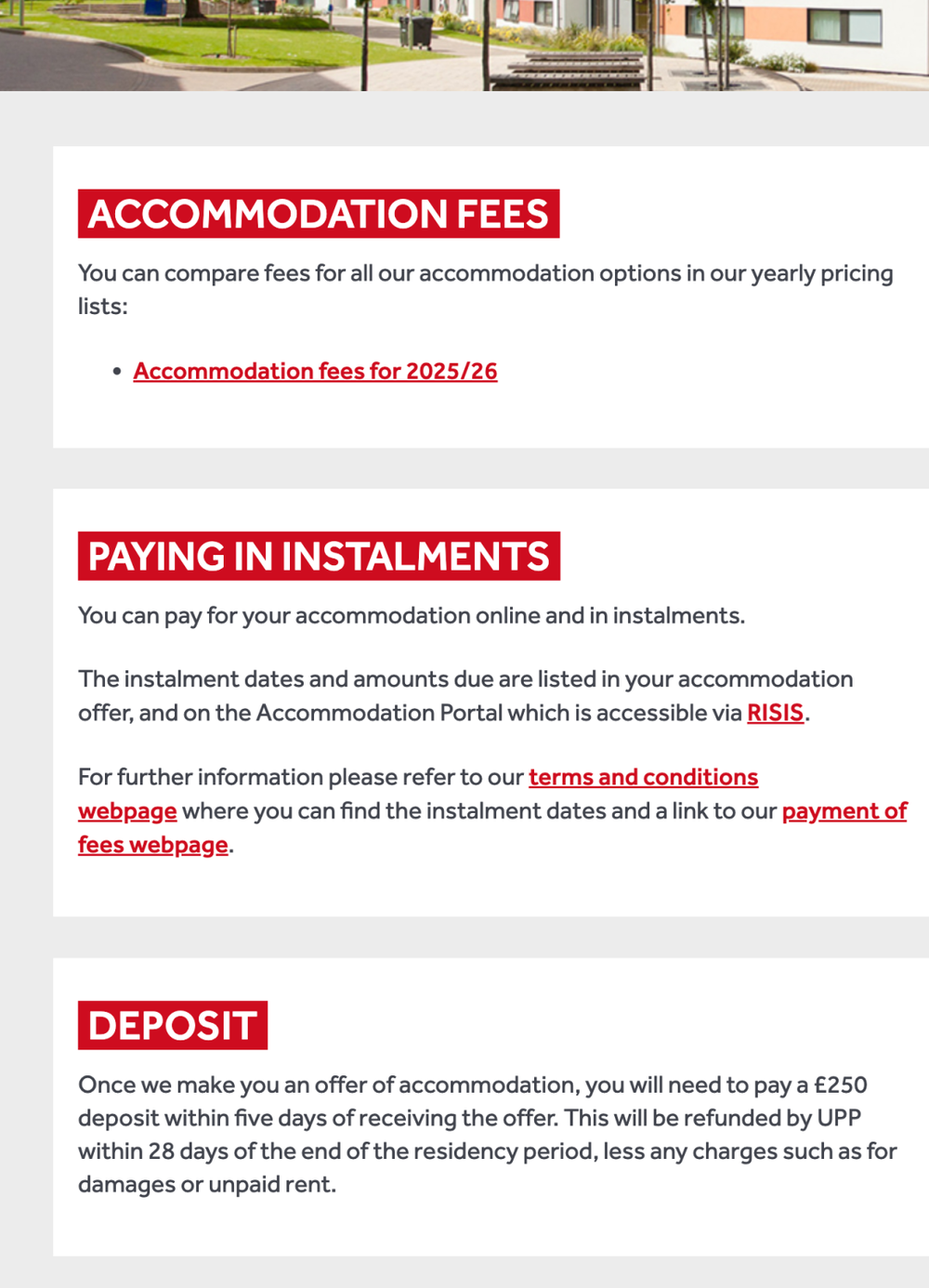 以下是英国雷丁大学宿舍付款说明页的截图,很直接地说了你可以分期付款,不过有些条件规定。这个每家规定都不太一样,请大家自行甄别。