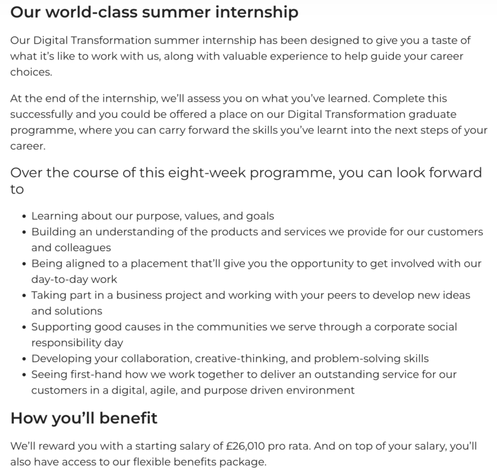 以下是NatWest银行放出的2026年“数字化转型实习”JD,具体我就不翻译了,在网上能大量搜到。需要注意:1)在英国,salary指年薪而不是月薪,2)实习项目只有8周,能不能拿到这个starting salary存疑。