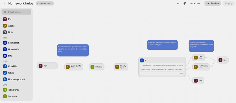 AgentKit的構件包括Agent Builder、Connector Registry及ChatKit。其中Agent Builder為建立多代理人workflow及管理版本的視覺化工作區(canvas),使用者利用拖拉節點、連結工具來建立控制邏輯,還能設定自己的護欄。它並支援預覽執行、自訂inline評估、及完整的版本管理。