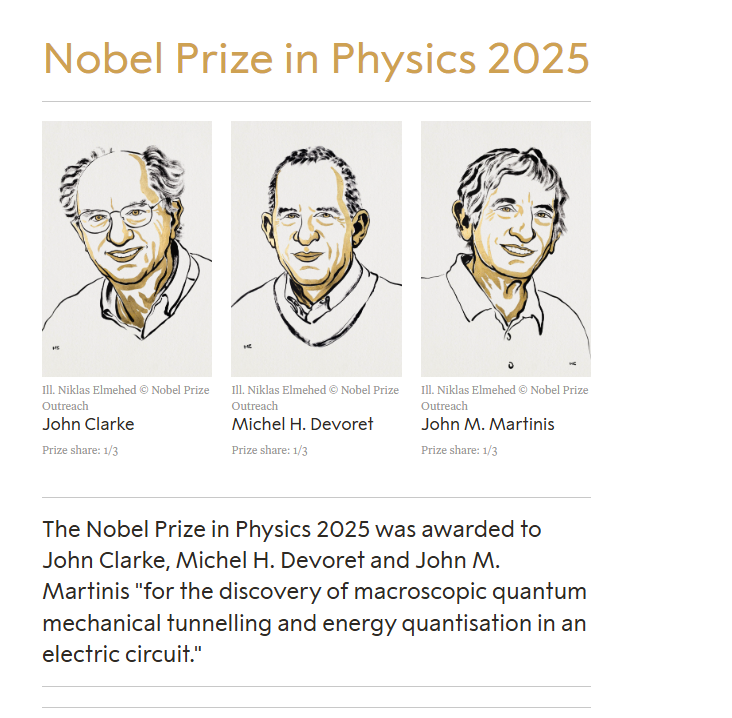 当地时间10月7日,瑞典皇家科学院决定将2025年诺贝尔物理学奖授予科学家约翰·克拉克 (John Clarke)、麦克·H·德沃雷特 (Michel H. Devoret) 、约翰·M·马蒂尼 (John M. Martinis),以表彰他们“发现电路中的宏观量子力学隧穿和能量量化”。获奖者将平分1100万瑞典克朗(约合836万元人民币)奖金。