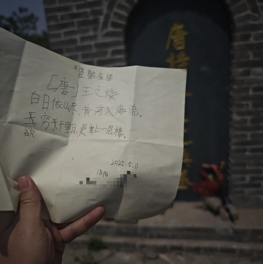 而在王之涣的墓前,最令我感动的,则是一张写着《登鹳雀楼》的白纸,纸上的笔迹稚嫩,一看落款人,果然是个小学生——中华文化的传承在此刻具象化了。