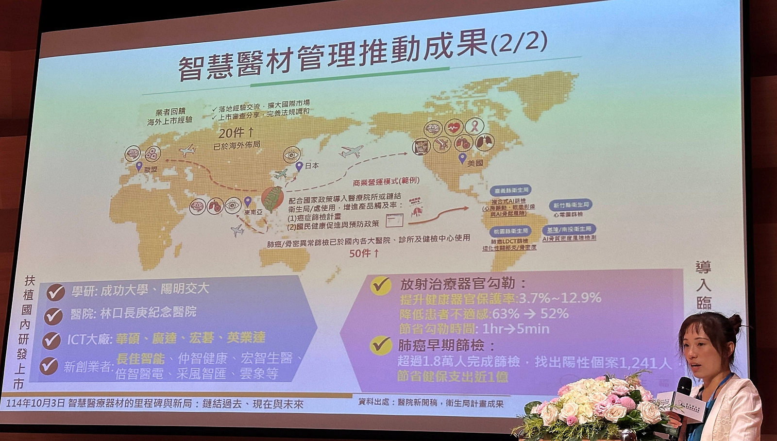 吳亭瑤表示,已取證的國產智慧醫療業者,也有20多件布局海外,另也有些產品配合國家政策,導入醫療院所或衛生局/處使用,比如嘉義縣衛生局就採用包含心房顫動、眼底影像和AI骨鬆風險的複合式AI篩檢系統,又或是新竹縣衛生局導入心電圖篩檢AI、桃園縣衛生局導入肺癌LDCT篩檢。(如下圖)