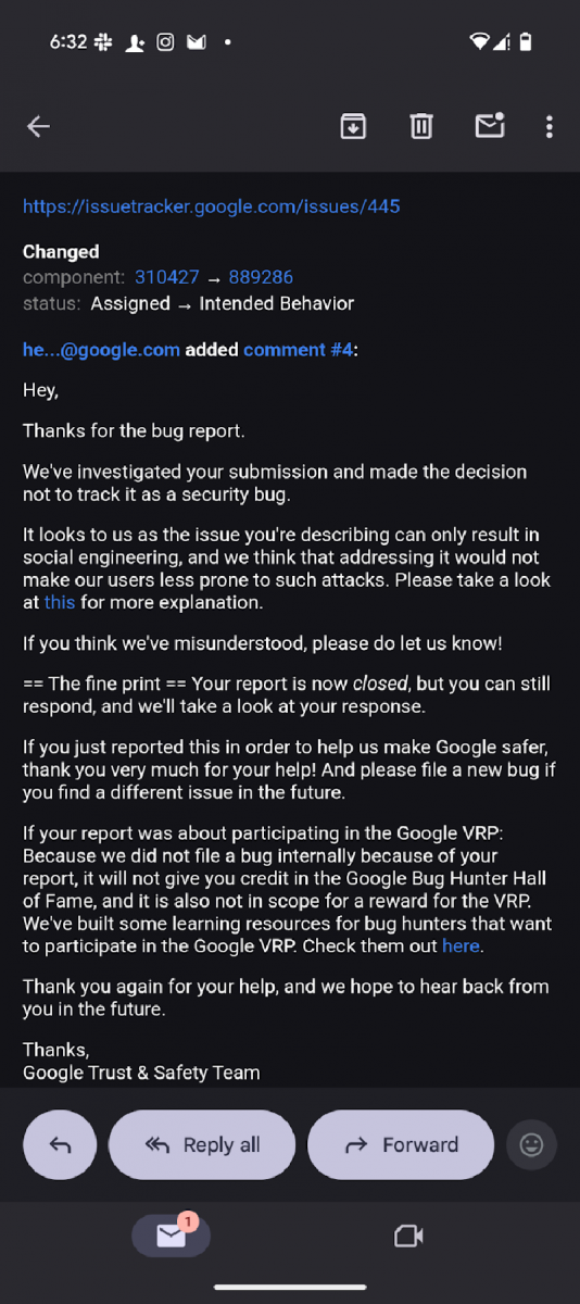 研究人員就研究結果向Google進行通報,獲回覆為暫不採取行動。根據Google信件回覆(下圖),經Google內部調查後認為回報內容屬於預期行為,而非系統性安全漏洞,該問題主要涉及社交工程情境,並不構成技術層面的資安缺陷,因此不會納入安全性追蹤或修補流程。FireTail研究團隊其後公開細節,並將此定義為應用層的輸入處理問題,呼籲使用者強化自家流程的可觀測性與稽核。