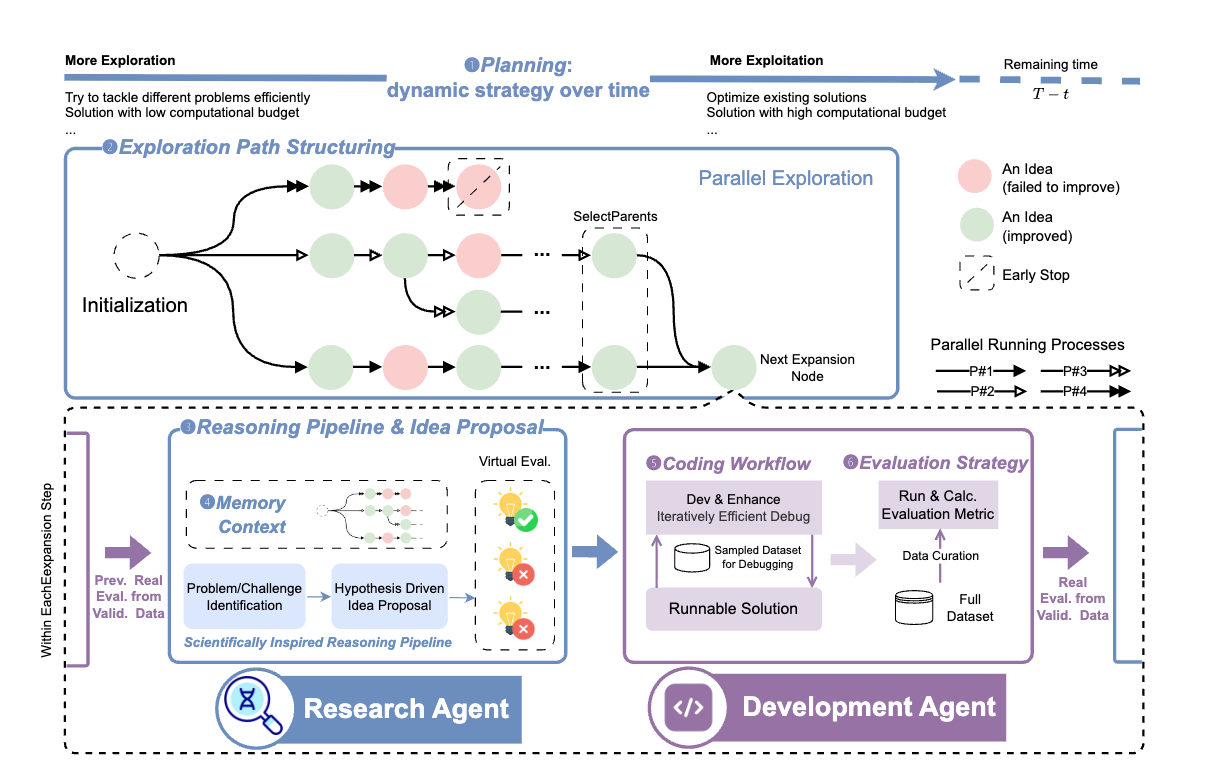 R&D-Agent 的整体架构分为两个阶段:研究阶段(Research Phase)和开发阶段(Development Phase)。研究阶段由四个部分组成:规划、探索路径结构、推理管线和记忆上下文,它们通过反馈机制持续循环,不断在假设、实验与分析之间往复,让系统在多轮探索中自动调整方向、积累知识、优化策略;开发阶段则承接研究成果,主要包括编码工作流与评估策略,前者把想法变成可执行代码,后者负责验证与对比结果,确保系统演化出的改进真实可靠。两个阶段形成首尾相接的闭环,让科研过程实现持续反馈与自我进化。