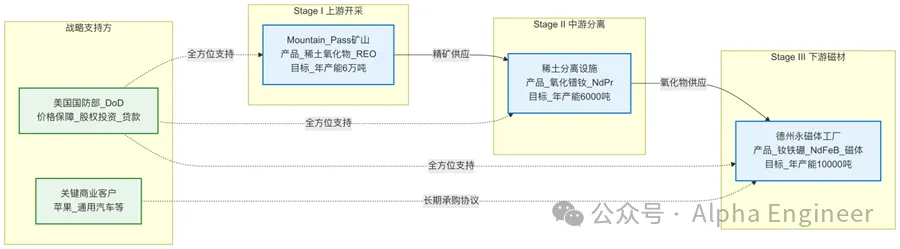 MP Materials旨在打造独立于中国的西方稀土全产业链,其核心是通过Stage I、II、III三阶段垂直整合战略,从上游矿产资源延伸至下游高附加值的永磁材料制造,以确立其在地缘政治和关键供应链中的核心地位。