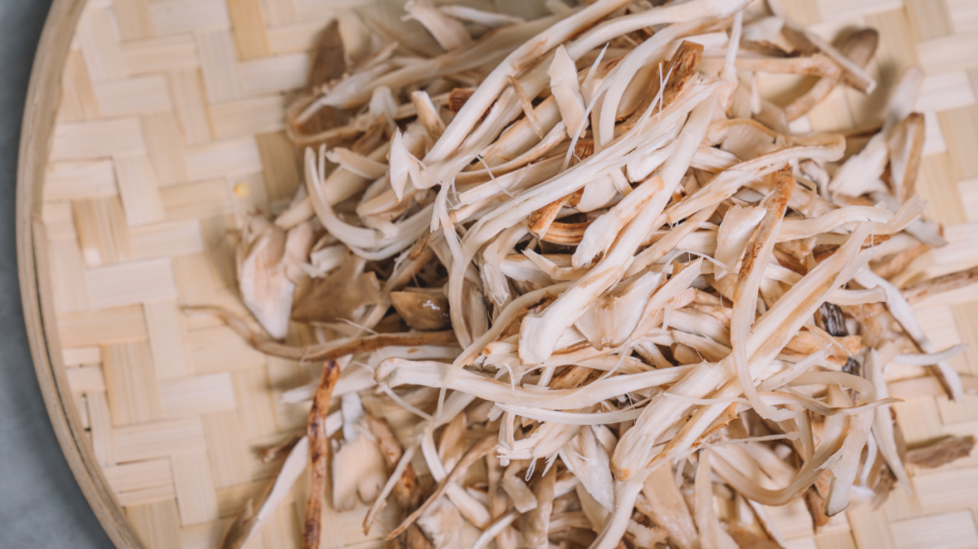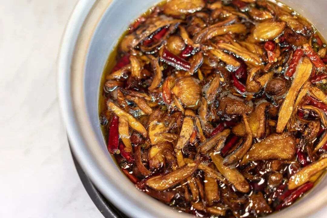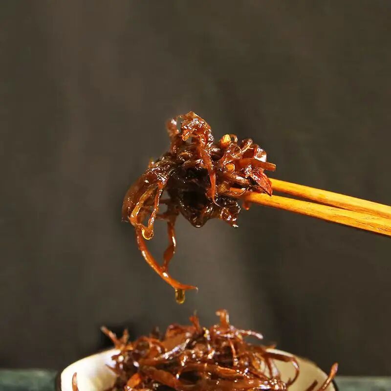新鲜鸡枞手撕成条,低温慢炸至金黄,再倒入菜籽油,加入干辣椒、花椒、蒜片,封坛存放,往往3-3.5斤新鲜鸡枞才能出1斤油鸡枞,非常珍贵。油润的鸡枞丝酥脆鲜香,拌面、炒饭、蘸馒头,只要一小勺,整道菜立刻熠熠生辉。有了它,简直就是上班族和做饭手残党的福音。