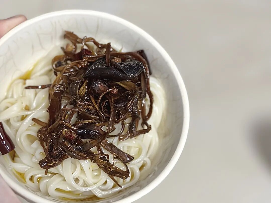 油鸡枞炒鸡蛋让你秒变美味大厨。热锅冷油,打散的土鸡蛋滑入锅中,快熟时加入少量油鸡枞,简单翻炒,菌子的鲜甜和蛋香交融,口感嫩滑中带着微微的脆,配一碗白米饭,就是最满足的一餐。 再来个五分钟的极致享受,油鸡枞拌面——将煮好的碱水面,拌上一勺油浸鸡枞,再淋点生抽、撒点葱花,鸡枞的油脂裹着面条,鲜香浓郁,每一口都带着山野的灵气,简单却让人上瘾。