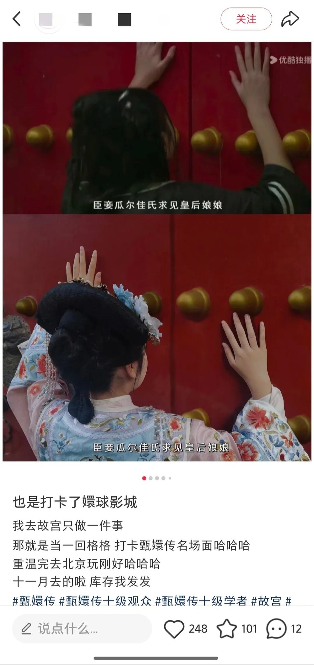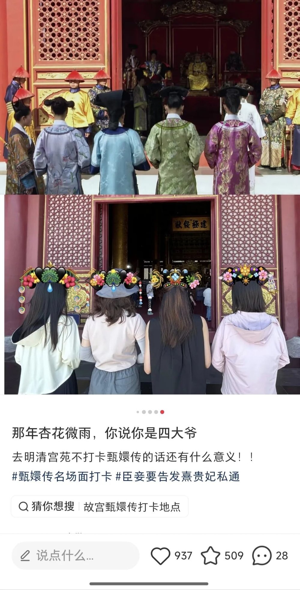 《甄嬛传》恰好为游览故宫提供了一套现成的“体验剧本”。在社交媒体上,“来故宫打卡只干一件事——重温《甄嬛传》”成为无数剧迷的选择。人们除了可以按照剧情发展来设计游览路线,在特定场景回忆对应情节、模仿剧中人物的行为举止,还可以自由发挥,弥补剧中人物的悲情结局所带来的遗憾。