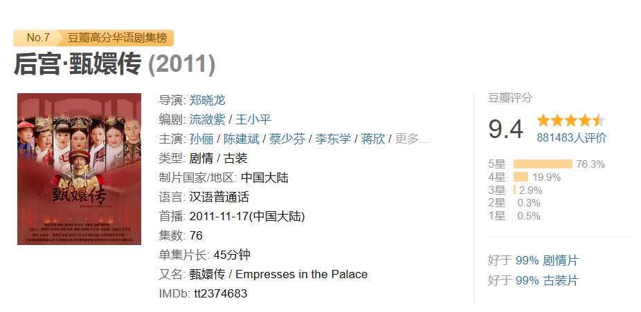 《甄嬛传》这部剧在豆瓣的评分高达9.4。(图/豆瓣)