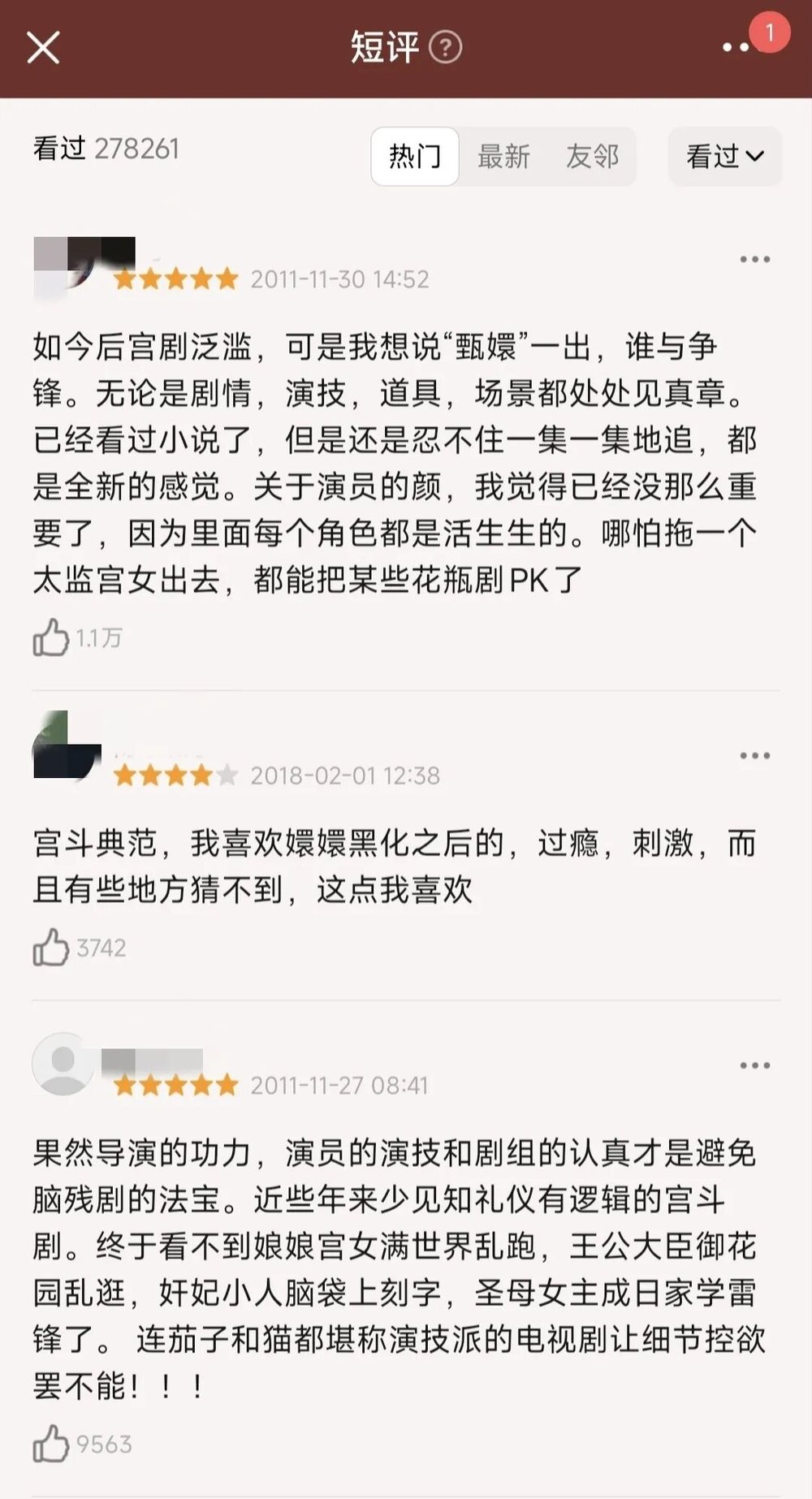 《甄嬛传》电视剧豆瓣短评下网友发表议论,最高点赞量达1.1万,引发广泛共鸣。(图/豆瓣)