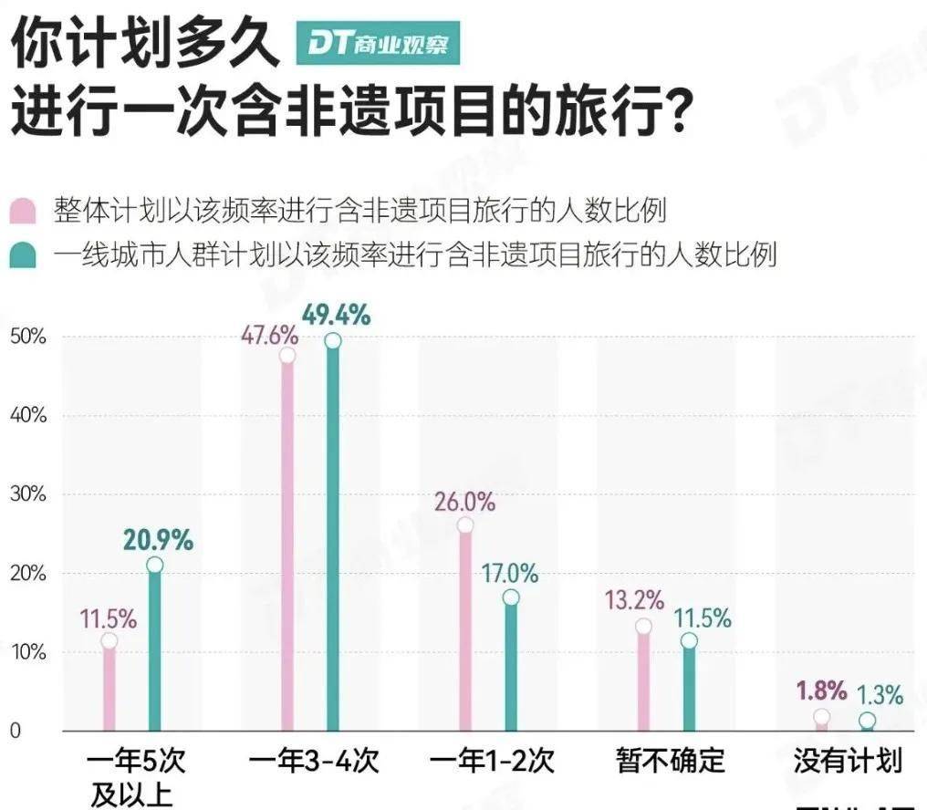 《DT商业观察》调研数据显示,85.1%的受访者都有非遗旅行的规划。其中,47.6%的人计划每年3-4次非遗旅行,26%的人计划每年1-2次。近9成受访者愿意为了非遗体验专程奔赴一座城市,而48.1%的受访者去过三线及以下小城体验非遗。乌镇、景德镇、歙县凭借 “原生态非遗”,更是直接冲进了热门县域 TOP10。对平时生活在一线城市的游客来说,这种 “在风景里学手艺、在美食里品生活” 的体验,新鲜又治愈。