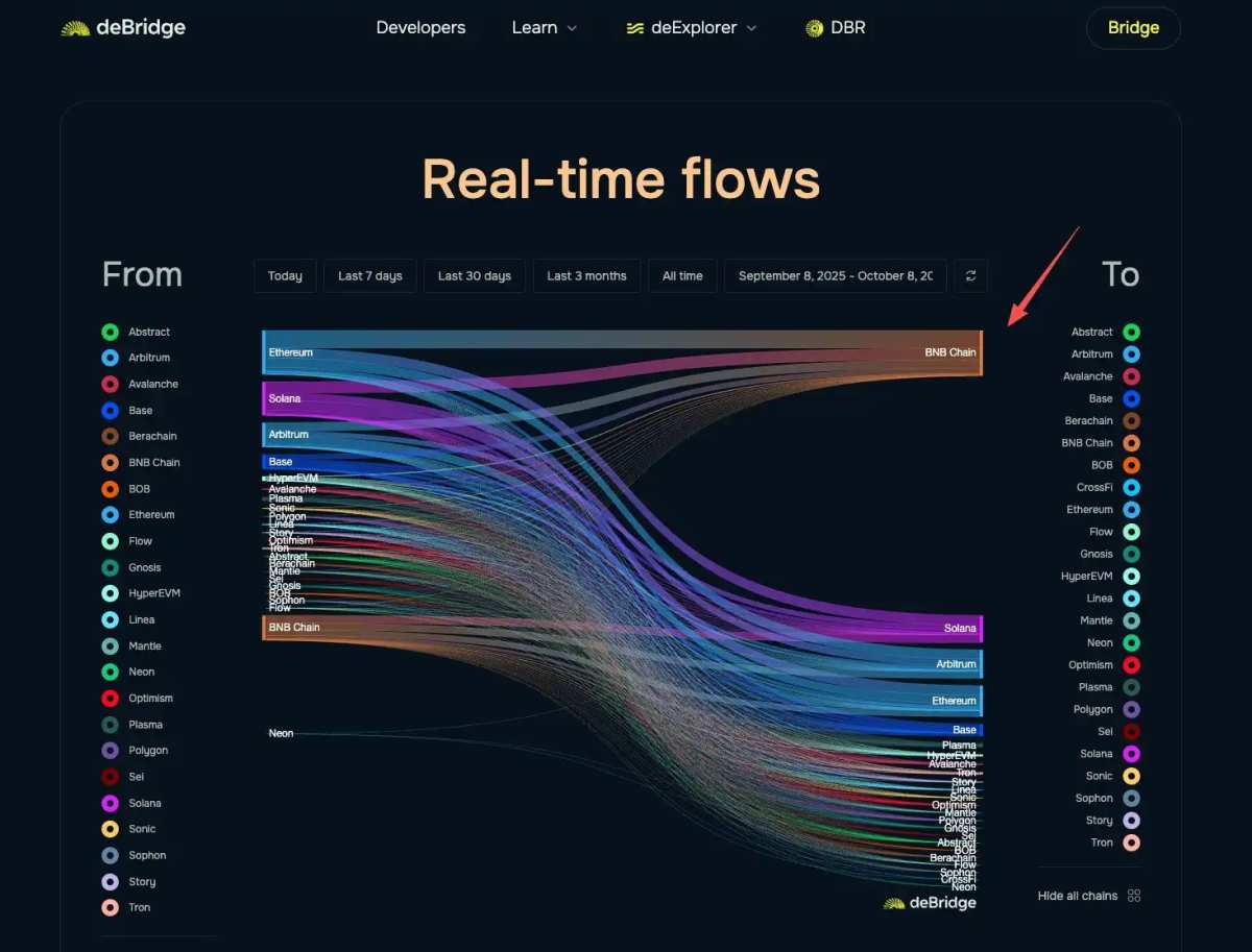 据 DeFillama 数据显示,BSC 网络过去 24 小时费用达 557 万美元,排名公链第一。Tron 网络(146 万美元)排名第二,以太坊网络(120 万美元)排名第三。并且从全网资金流动情况来看,BSC 已经出现了资金虹吸效应。