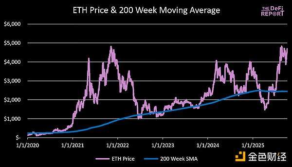 目前,我们正处于牛市。但它不会永远持续。鉴于ETH在2018年下跌了94%,在2022年下跌了80%,我们应该预期会出现另一次急剧下跌。我们不知道这何时会发生。但我们确实知道ETH在过去的周期中,相对于我们追踪的几个重要技术指标所达到的水平。本周,我们分享我们的分析,旨在帮助你锚定潜在结果并相应规划。免责声明: 所表达的观点为作者个人观点,不应作为投资建议依赖。我们开始吧。关键技术指标分析与价格目标200周移动平均线