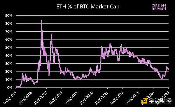 数据来源:The DeFi Report, GlassnodeZ-Score告诉我们市值高于或低于链上成本基础多少个"波动单位"。高值表明统计上过热状况。负值则表示低估。自2017年1月1日起,ETH的Z-Score平均值为0.99——表明存在偏向乐观的倾向(市场价值高于已实现价值)。当前值为1.66(高于历史平均水平,但并非过度"过热")。上个周期,在6.5(4月顶部)和3.48(11月顶部)见顶。情景分析:· Z-Score为2.21:ETH 7000美元· Z-Score为2.77:ETH 8000美元· Z-Score为3.33:ETH 9000美元· Z-Score为3.9:ETH 10000美元ETH vs BTC