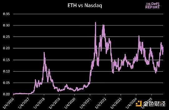 数据来源:The DeFi ReportETH目前交易价格对应的ETH市值占BTC市值的23.4%。2021年11月,ETH市值达到BTC市值的55.5%的峰值。如果BTC达到15万美元(较当前上涨23%),这将使BTC市值达到3万亿美元。情景分析:· 占BTC市值的35%:1.05万亿美元,或 ETH 8,658美元· 占BTC市值的45%:1.35万亿美元,或 ETH 11,132美元· 占BTC市值的55%:1.64万亿美元,或 ETH 13,559美元关键问题在于我们是否会看到BTC出现显著上涨,以及ETH相对于BTC的走势相较于上一个周期是温和还是爆发性的。ETH vs 纳斯达克
