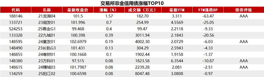 据Choice 数据统计显示,今日交易所市场非金信用债涨幅排行前五的分别是:21龙湖04、23周发01、25蓉金G1、22九城01、24重发01。具体如下: