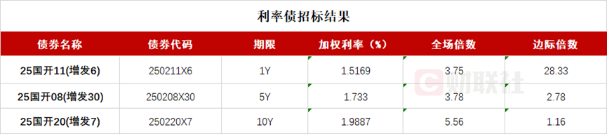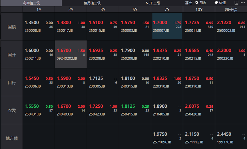 银行间主要利率债收益率全线下行,截至下午16:30,10年期国债活跃券250011收益率下行0.95bp报1.7735%,30年期国债活跃券2500002收益率下行0.8bp报2.122%,10年期国开活跃券250215收益率下行0.4bp报1.9585%。