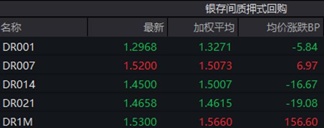 银银间回购定盘利率全线下跌。FDR001跌7.0个基点报1.33%;FDR007跌10.0个基点报1.5%;FDR014跌30.0个基点报1.5%。