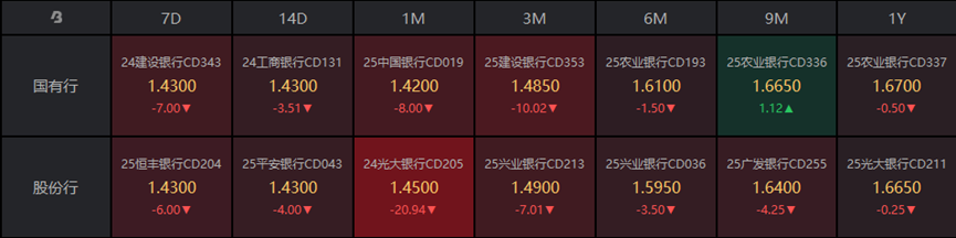 存单方面,今日9M国股报在1.63%的位置,1Y期国股报在1.63%的位置,较前一交易日持平。二级存单方面,3M国股成交在1.485%附近,较前一交易日下行10bp,1Y国股成交在1.67%位置,较前一交易日下行0.5bp。