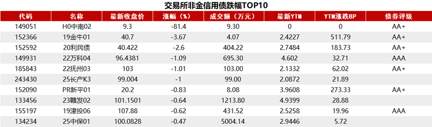 据Choice 数据统计显示,今日交易所市场非金信用债跌幅排行前五的分别是:H0中南02、19金牛01、20利民债、22万科04、22抚州03。具体如下: