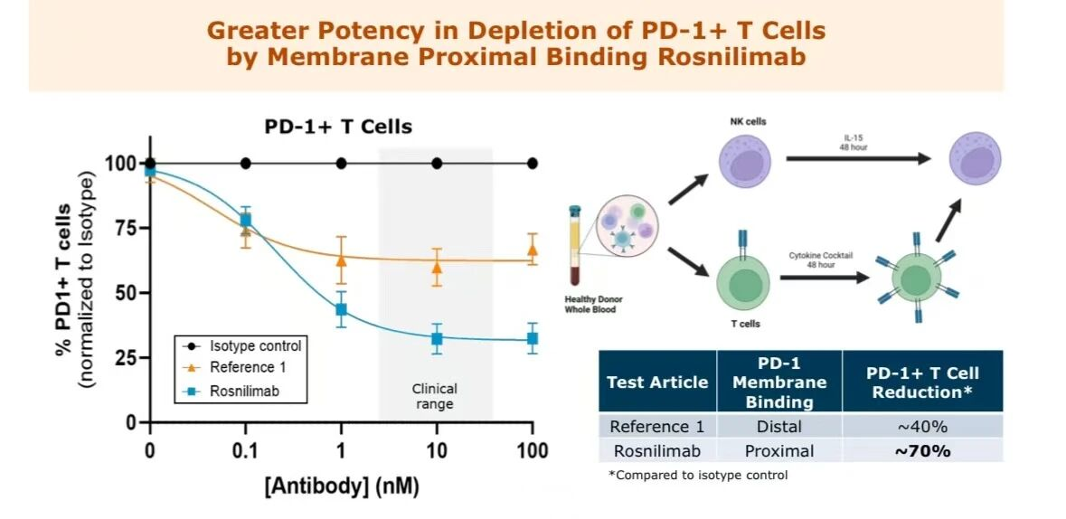 Rosnilimab药物的核心优势在于靶向性更强、耗竭致病性T细胞效应能力更优。它能够特异性结合PD-1的膜近端表位,相比其他PD-1激动剂(如礼来Peresolimab、强生JNJ-67484703),可在外周血中消耗超过90%的致病性T细胞,而后者仅能消耗约60%。