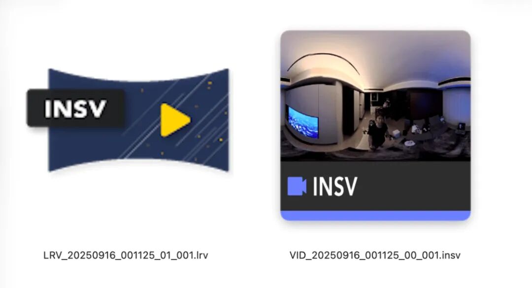 以 Insta360 X5 的普通录像模式为例,这个模式下拍摄的单个视频会在存储卡中分别生成后缀格式为 .insv 和 .lrv 的文件,其中前者为 Insta360 的专有文件格式,用于存储高比特率的两路鱼眼视频数据以及陀螺仪 / 加速度计数据、曝光值、时间戳等各类传感器信息,是拍摄得到的主要文件内容;后者是 Insta360 相机为拍摄内容自动生成的低分辨率代理文件 (Low-Resolution Video),用于快速查看或在剪辑工具中预览调用,以减少硬件负载和渲染压力。