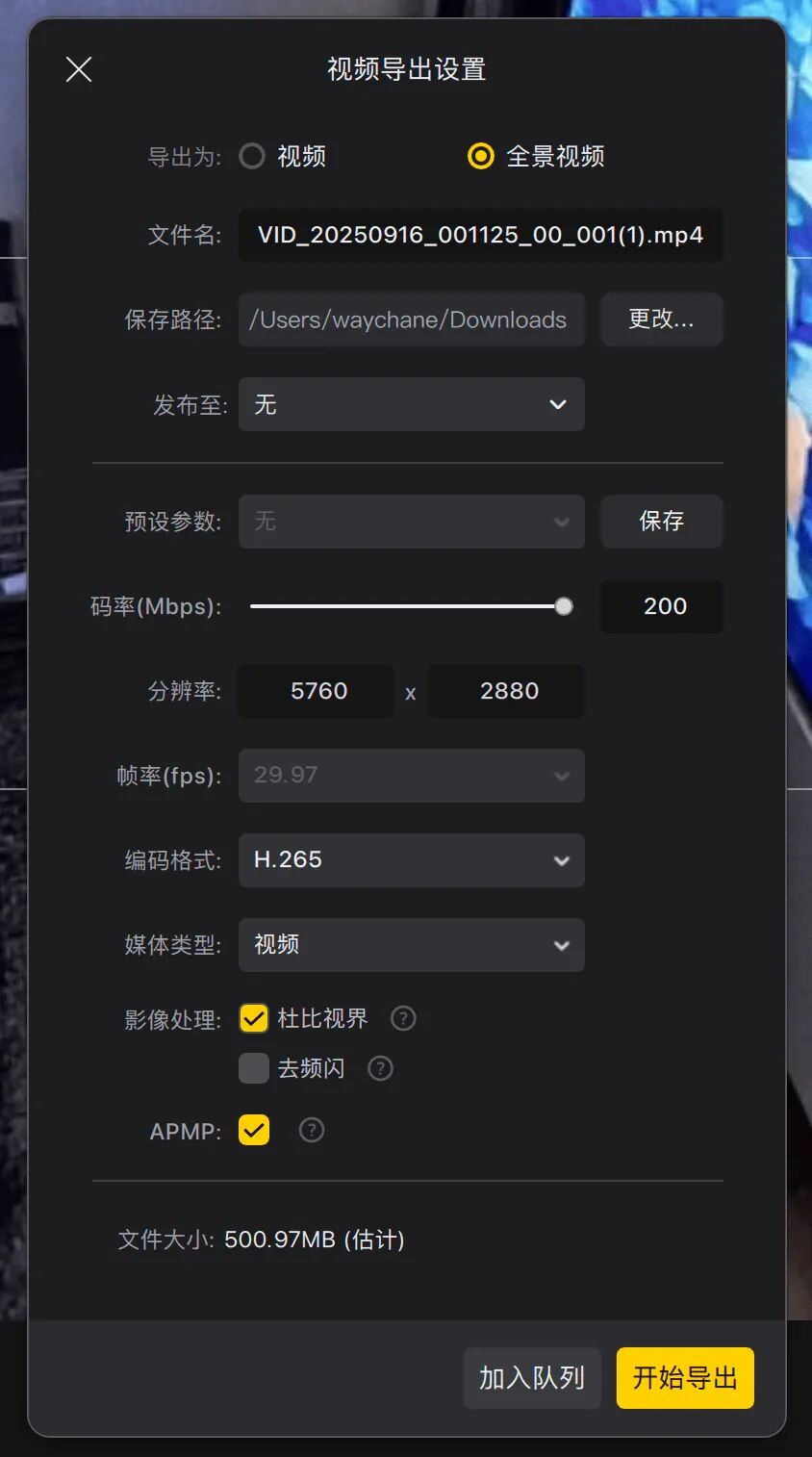 对于 Insta360 Studio 的其它功能,这里不作展开介绍,直接看导出菜单。打开 Insta360 Studio 选中相应视频并选择导出后,我们需要在导出菜单中选择「全景视频」,并勾选下方的「APMP」选项,勾选导出时 Insta360 Studio 会将成片按 APMP 投影媒体规范封装与标记,让其在 Apple Vision Pro 中能被识别成可原生播放的沉浸式视频,同时在不支持的设备上能够回退为普通 2D 视频形式播放。