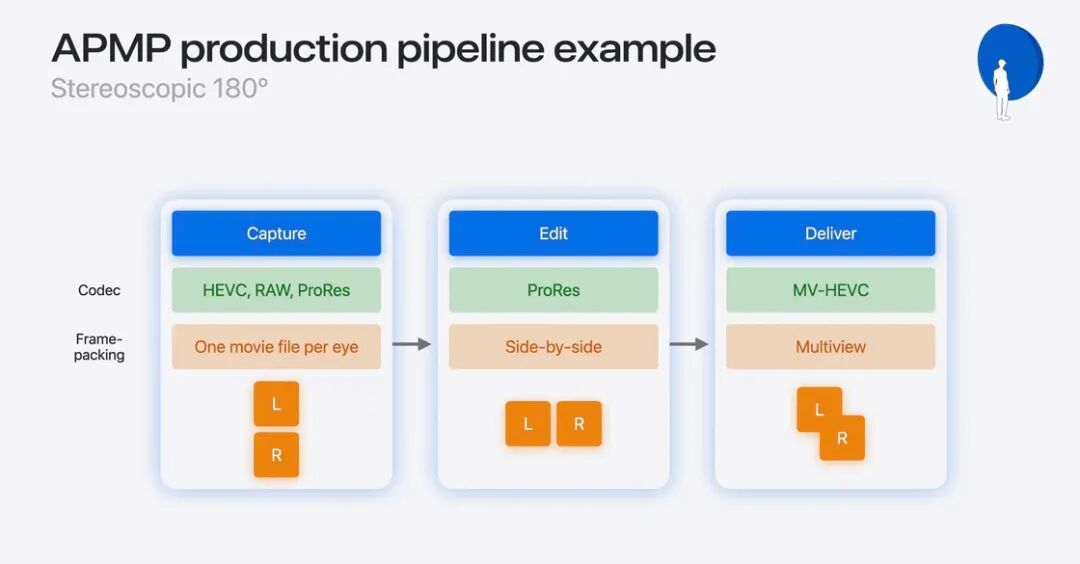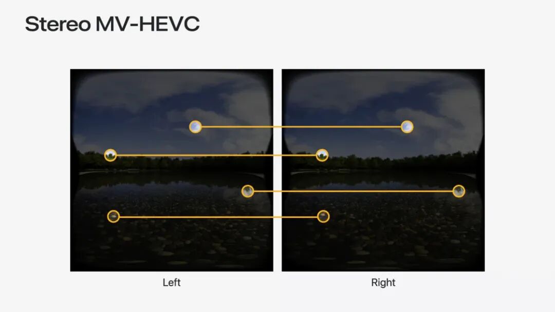 对于开发者而言,视频片源需要分别提供时长和帧率完全一致的左右眼文件,且使用高位深格式和 HDR 色彩空间重新将文件编码为 MV-HEVC,MV-HEVC 轨道会通过 vexu 扩展 (Video Extended Usage) 标明该轨道的左右眼视图和默认视图,以便播放器确定如何将每个视图映射到用户的左眼或右眼。