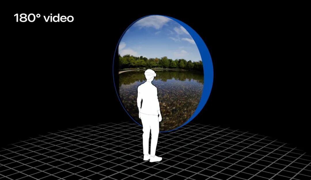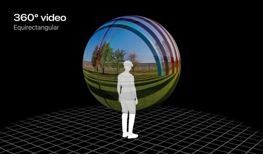 在 visionOS 26 中,Apple 将传统的 180°、360° 和宽视场视频统称为「沉浸式视频」,与前述的 2D、3D 和空间视频采用直线投影 (Rectilinear projection) 不同,在 Apple Vision Pro 这样的空间计算设备中,渲染空间并不仅局限于我们观看前方的平面区域,开发者也可以在虚拟环境中的观看者周围铺满像素,并且需要考虑镜头曲率或弯曲变换,因此需要采用非直线投影 (Nonrectilinear projection) 方式渲染视频内容。