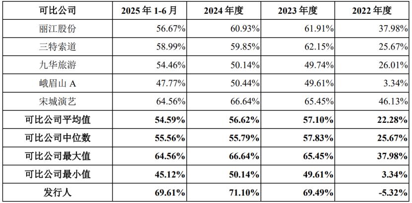 报告期各期,陕西旅游的主营业务毛利率分别为-5.32%、69.49%、71.10%和69.61%,波动较大。其中,2022年公司毛利率较同行业可比公司偏低;2023年公司毛利率高于同行可比公司均值,除文旅市场强劲复苏以外,公司冬季版《长恨歌》受到市场的广泛认可,对传统淡季收入实现了有力的补充。