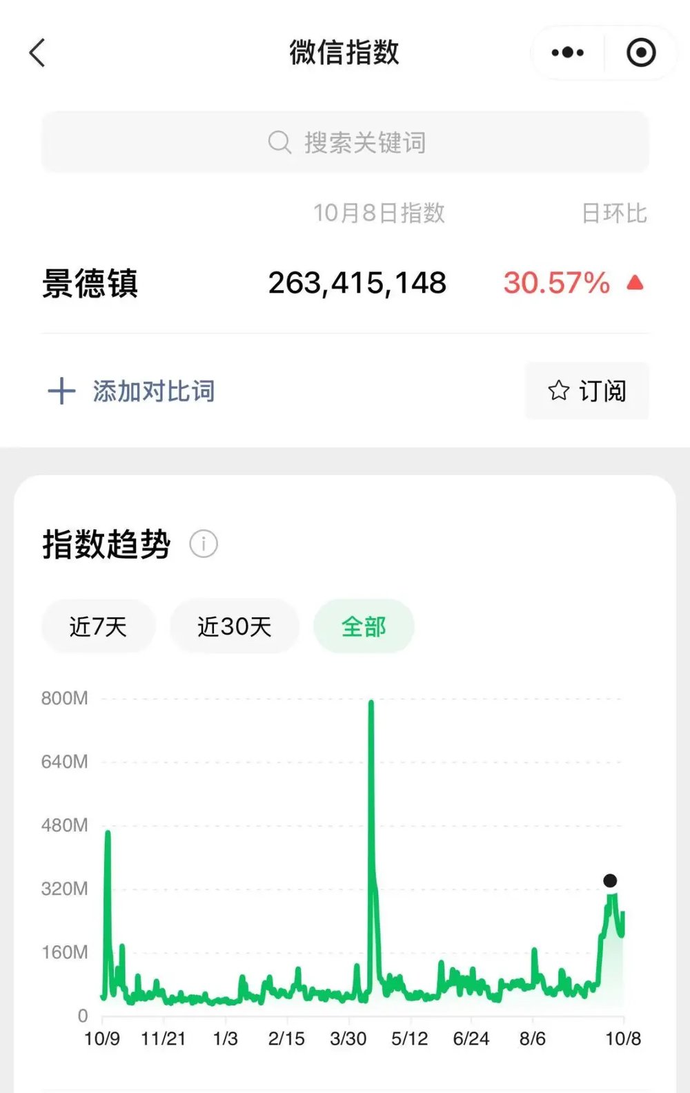 仅小红书平台,“景德镇”相关话题的浏览量就超50亿次,比现象级网红城市淄博还高。作为一座人口仅160万的小城,过去两年,每逢国庆黄金周都有超800万游客涌入景德镇,屡次出现人满为患的“盛况”。