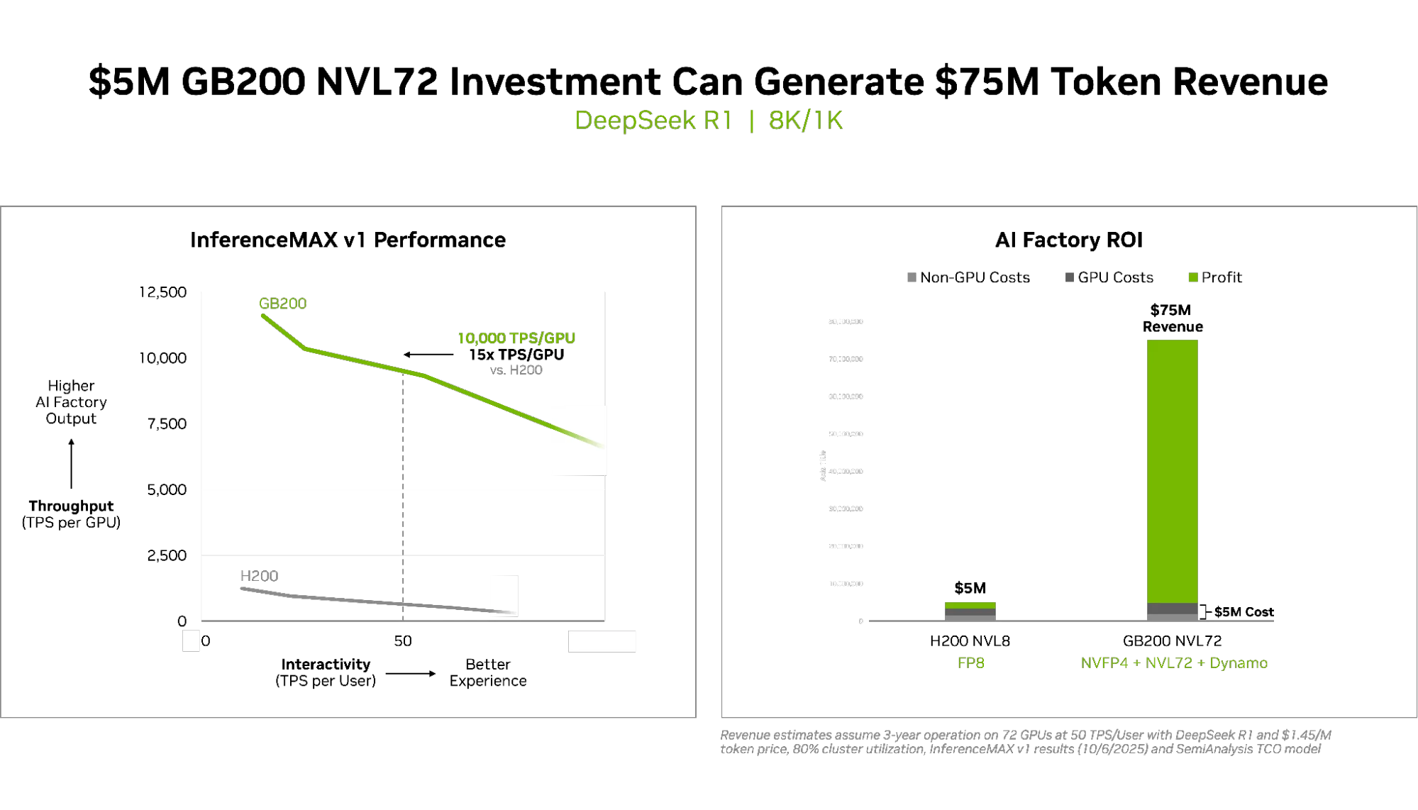 The launch of SemiAnalysis InferenceMAX v1 benchmarking suite introduces an open source and continuously updated framework for measuring inference performance. Through InferenceMAX v1, the NVIDIA Blackwell family has emerged as a clear leader, with B200 and GB200 NVL72 demonstrating up to 15x improvements in performance over the previous Hopper generation and driving up to a 15x revenue opportunity for AI factories.