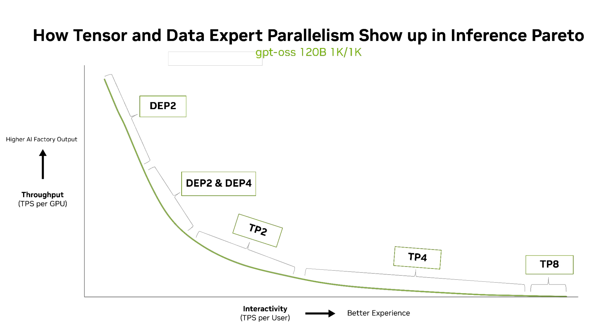 In addition, parallelism configurations like DEP achieve high throughput by distributing gpt-oss-120b Attention and MoE layers across multiple GPUs. This rapid, all-to-all communication is made possible by the 1,800 GB/s bidirectional bandwidth of NVLink and the NVLink Switch, which avoids traditional PCIe bottlenecks. The resulting high concurrency enables the system to serve many simultaneous inference requests at full speed, keeping the hardware fully utilized for all users (Figure 3).