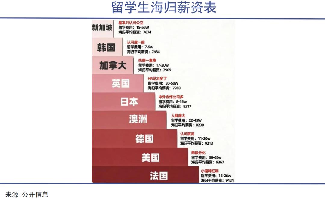 一个在社交媒体上流传广泛的海归薪资表显示,美、英、澳、日等热门留学国家的海归平均薪资集中在8000元左右。这个数字单独来看并不算特别低,但与动辄几十万乃至上百万的留学投入相比,性价比就显得相当低了。