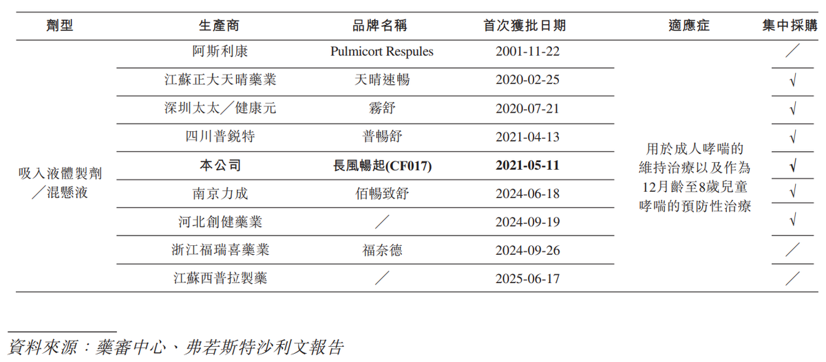 据长风药业介绍,CF017是一款治疗支气管哮喘的吸入用布地奈德混悬液,为公司的首个获批产品。自2021年5月获批以来,CF017覆盖了中国超过10,000家医疗机构。另外,根据弗若斯特沙利文的资料,按销量计,CF017占2024年中国布地奈德吸入药物市场份额约16%。