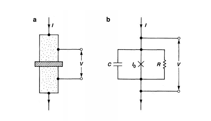 图2(a)是一个电流偏置的约瑟夫森结示意图,图中的散点阴影区表示超导体,中间的斜线阴影区则表示薄的绝缘层。(b)是它的等效电路示意图,一个实际的约瑟夫森结可以表示为一个电容c、一个理想的约瑟夫森结,以及一个电阻的并联结构。在零电压状态,这个电阻可以忽略。