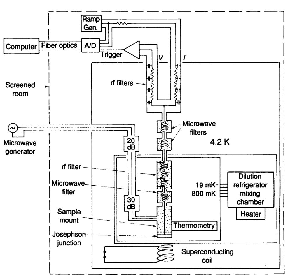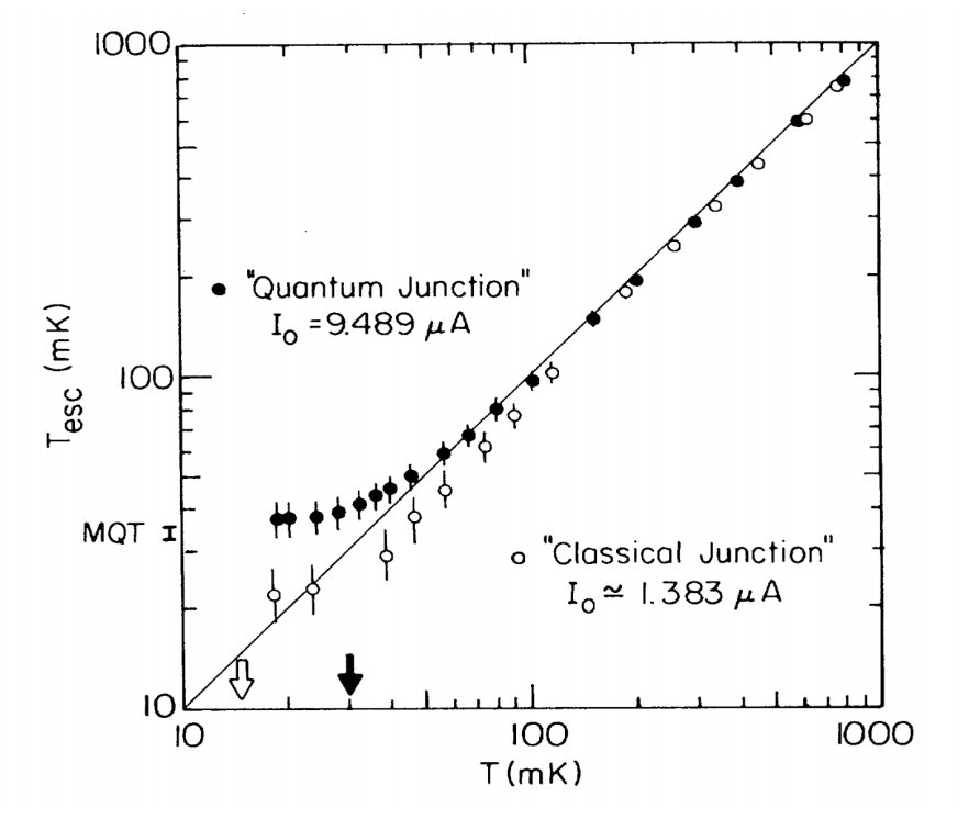 在1980年代早期,就已经有不同研究组在电流偏置的约瑟夫森结中寻找宏观量子隧穿的证据。测量的方法是通过逐渐改变偏置电流,测量约瑟夫森结从零电压态向有阻态“逃逸”的概率。随着温度的逐渐降低,这一逃逸率应该会逐渐偏离热激发逃逸率,而趋于一个稳定值,即进入“量子区域”。但这个实验存在一个问题,那就是即便你发现了这种偏离,该如何证明它不是由于其他噪声,比如说周围更热的物体的黑体辐射造成的?