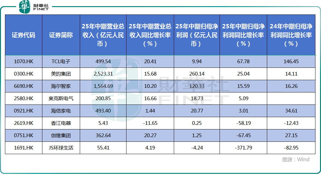从归母净利润的增速来看,TCL电子、美的集团、海尔智家、奥克斯电气、海信家电在2025年中期实现同比增长,而香江电器、创维集团、JS环球生活的盈利在今年上半年遭遇下滑。