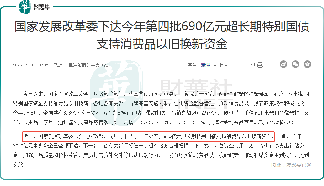 好消息在于,9月30日,国家发展改革委已会同财政部,向地方下达了今年第四批690亿元超长期特别国债支持消费品以旧换新资金,至此,全年3000亿元中央资金已全部下达。