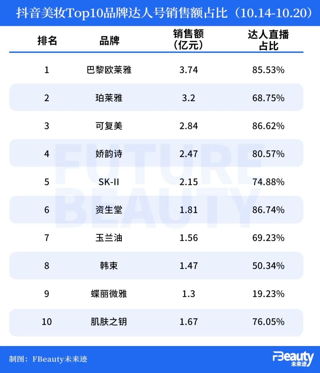 头部品牌也一样。去年双11期间,巴黎欧莱雅一周内卖出去了3.74亿元GMV,其中达播占比高达85%以上,可复美、娇韵诗、资生堂的达播占比都高于八成;珀莱雅、SK-II、肌肤之钥、OLAY等品牌达播占比也均在70%。