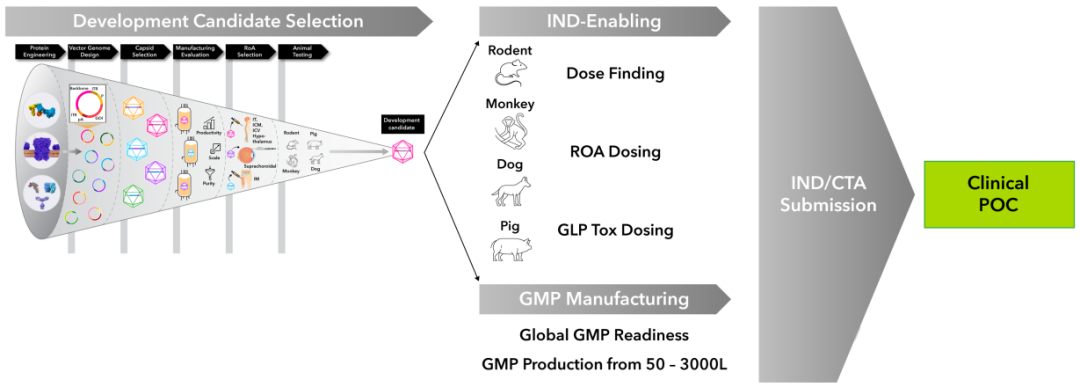 在此基础上,Kriya构建了覆盖从实验室到临床的完整体系,这一体系融合计算驱动的蛋白与载体设计、AAV血清型筛选、早期可制造性评估与动物模型验证,并与自有的大规模GMP产能打通,使候选产品能够快速进入临床开发并保持工艺一致性。借助这一闭环,Kriya不仅能高效孵化多条管线,还能在慢性病等大规模人群领域探索真正可持续的基因疗法。