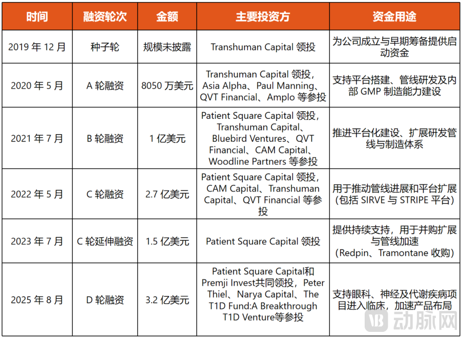 资本市场也迅速响应。自成立以来,Kriya已通过多轮融资与并购累计筹资超8亿美元,投资方包括专注医疗与生物科技的Pura Vida、在细胞与基因治疗领域活跃的Bluebird Ventures、全球对冲基金QVT、专注生命科学的Foresite Capital,以及阿布扎比主权基金Mubadala Investment Company等。2025年,公司完成3.2亿美元新一轮融资,资金将主要用于推动眼科、神经和代谢疾病管线进入临床阶段。
