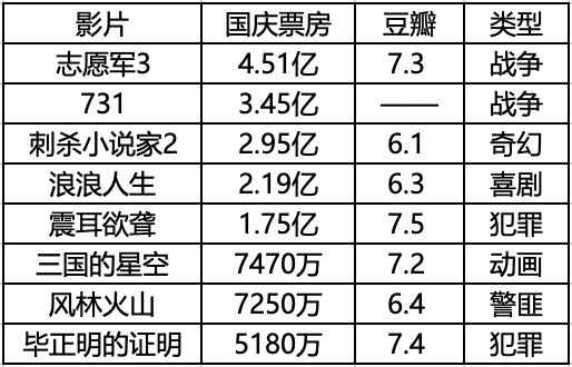 再看国庆档数据,市场即观众的选择,市场是最为正确的,不要企图纠正市场,根本纠正不来,或者说它本来就是对的,因此无需纠正。国庆档之所以走成这样,很难归结于品质、热度等问题,因为国庆档三部7分+,清一色达到6分+,主创亦是众星云集。