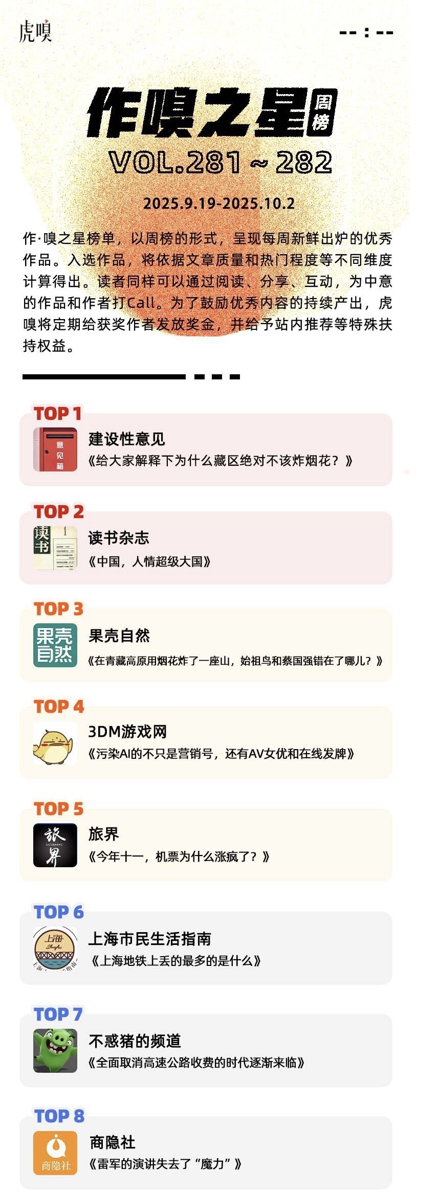 作·嗅之星榜单,以周榜的形式,呈现每周新鲜出炉的优秀作品。2025年9月19日~2025年10月2日,虎嗅第281~282期,作·嗅之星的获奖文章分别是: