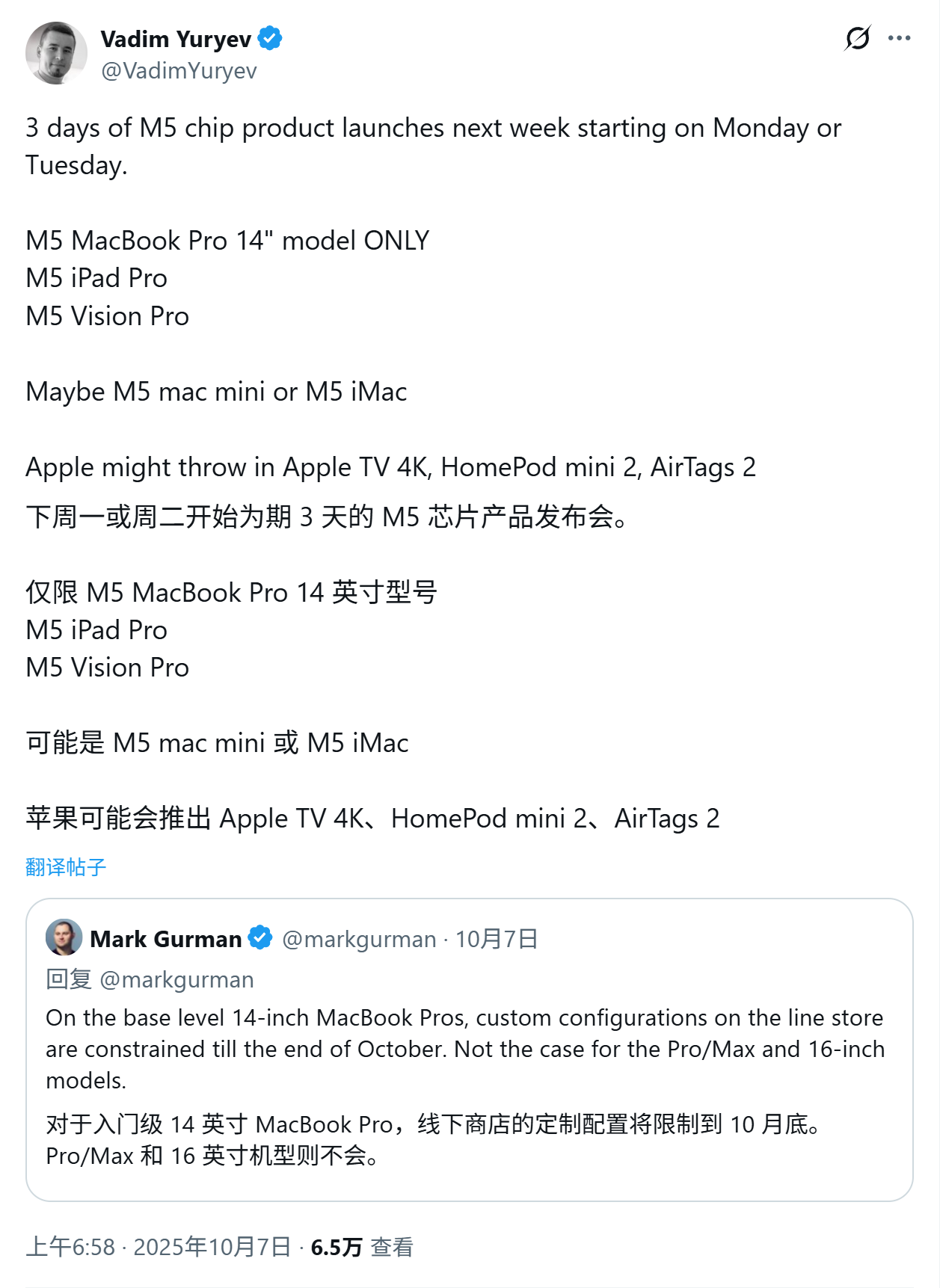 💻 **iPad Pro与Vision Pro亦有更新可能**:M5芯片版本的iPad Pro和升级后的M5版本Vision Pro也被提及,表明苹果正着力于在平板电脑和混合现实设备领域引入最新的芯片技术。M5芯片Mac mini和iMac的发布也存在可能性,但具体发布情况尚待确认。