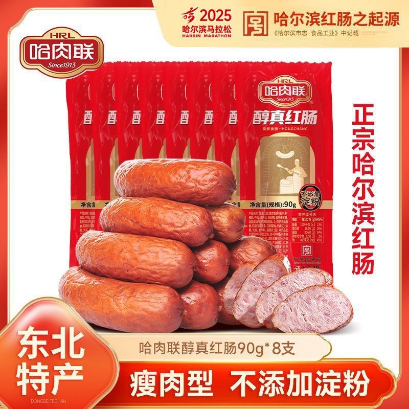 哈肉联醇真红肠90g5支,东北哈尔滨地道特产,选用优质猪肉精心灌制,肉质紧实富有弹性,口感醇香浓郁,咸香适口,回味悠长,开袋即食,方便快捷,独立小包装设计,干净卫生,适合家庭分享、户外旅行、办公室零食及儿童加餐。
