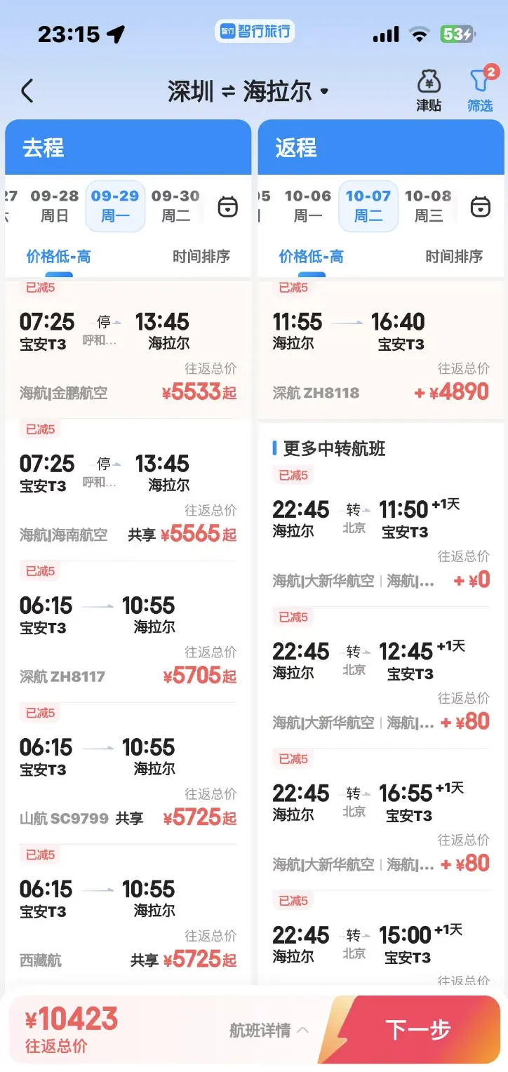 交通费用,是东北追秋最贵的花销。深圳往返海拉尔的机票,需要一万块: